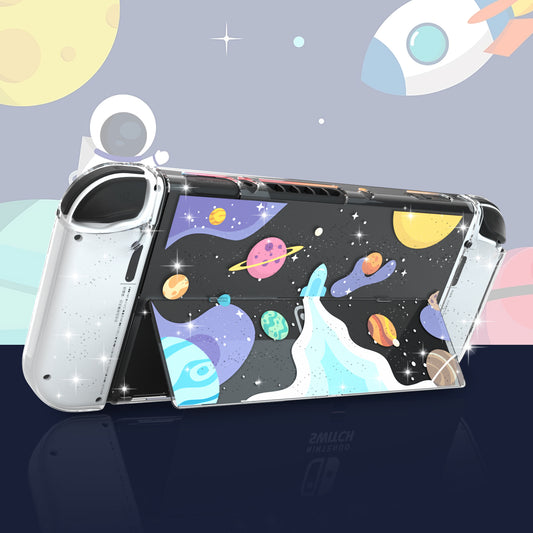 ECHZOVE Switch OLED Protective Case, Switch OLED Glitter Clear Case with Tempered Glass Screen Protector and Thumb Grips - Rocket